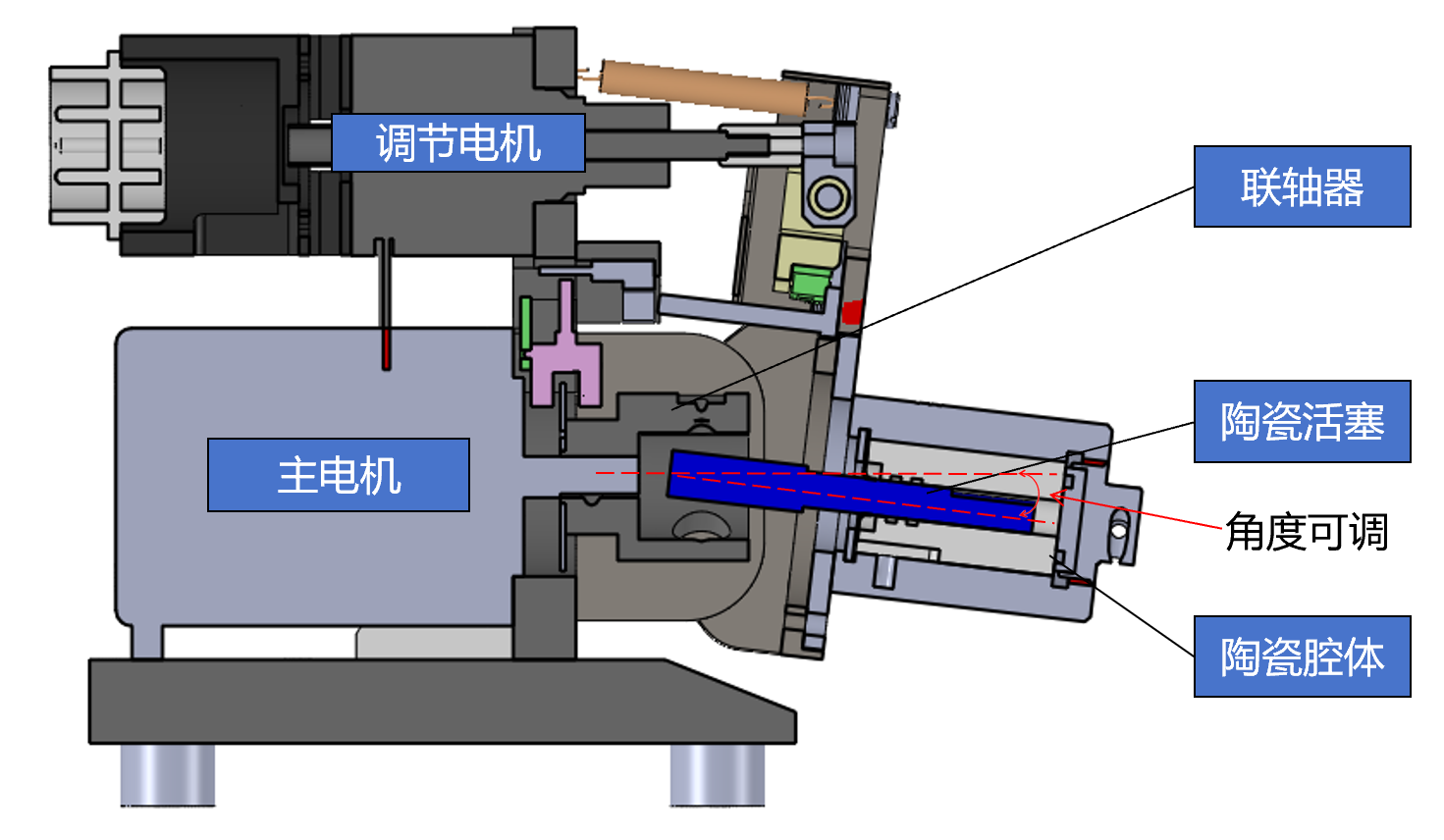 當注液泵工作時,由調節電機調節泵頭旋轉角度改(gǎi)變陶瓷柱(zhù)塞泵的行程。主電機帶動陶瓷柱塞泵進行旋轉往複運動,旋轉運動改變閥向,往複(fù)運動切換進出液。液體通過進液管及出液管吸進與排出。