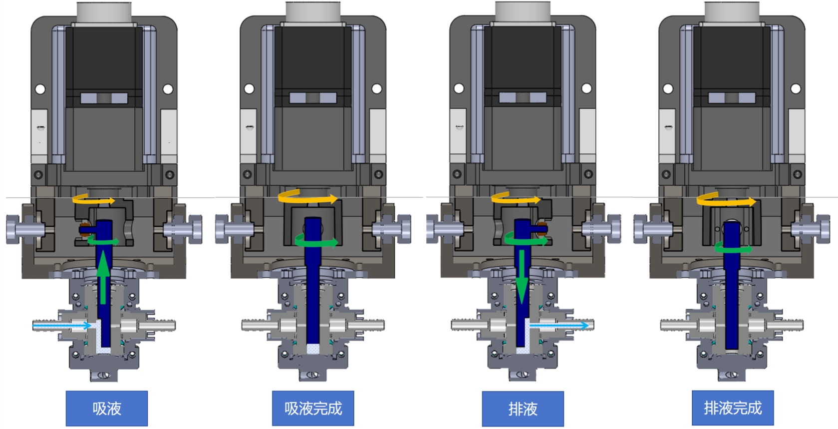 當注液(yè)泵工作時(shí),由(yóu)調節電機調節(jiē)泵頭旋轉角度改(gǎi)變陶瓷柱塞(sāi)泵的行程。主電機帶動陶瓷柱塞泵進行旋轉往複運動,旋轉運動(dòng)改變閥向,往(wǎng)複運動切換進(jìn)出液。液體(tǐ)通過進液管(guǎn)及(jí)出液管吸進與排出。